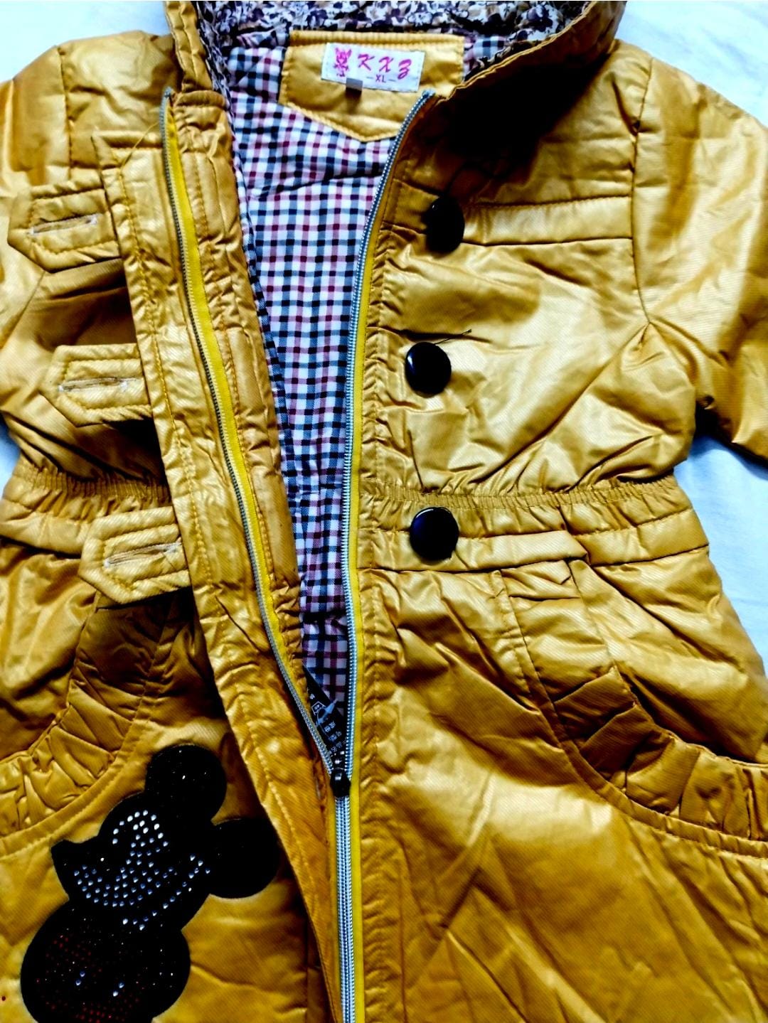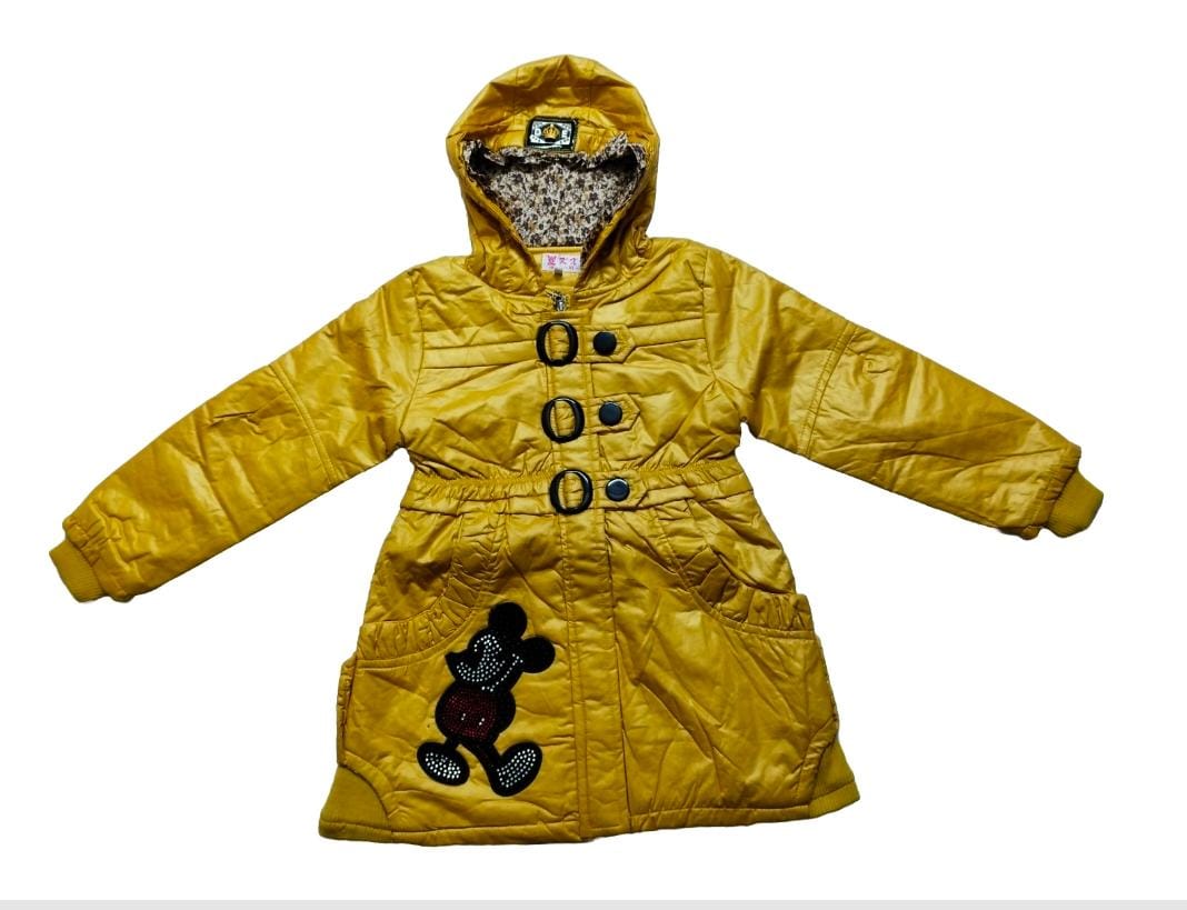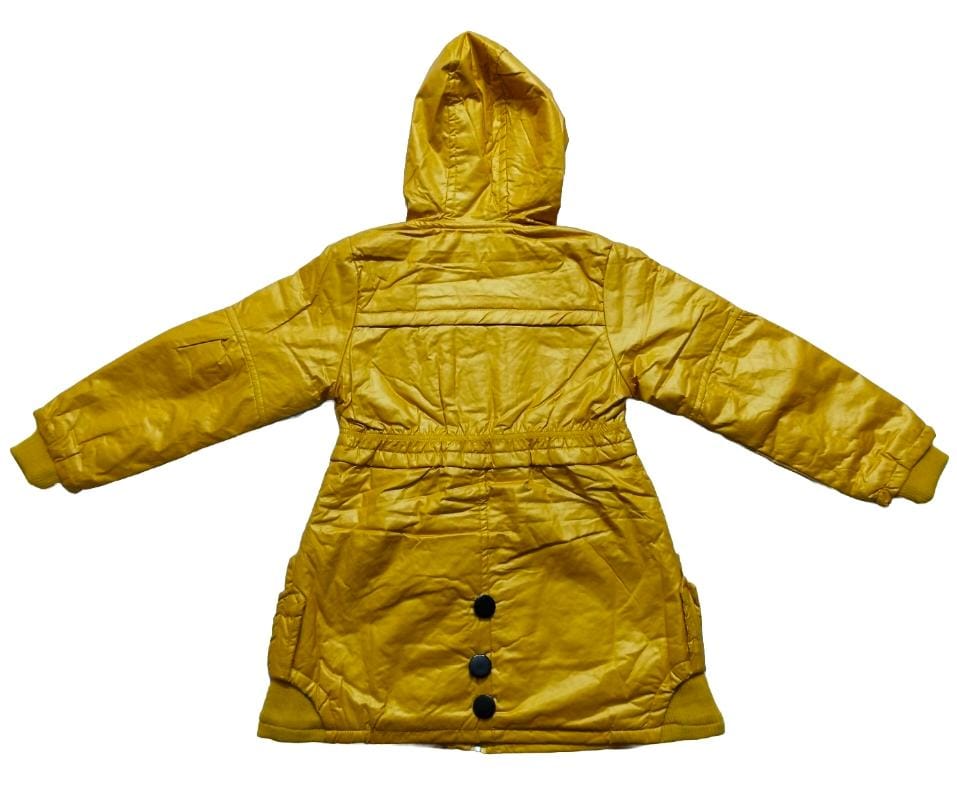 A stylish mustard yellow winter jacket designed for 7-year-old girls.