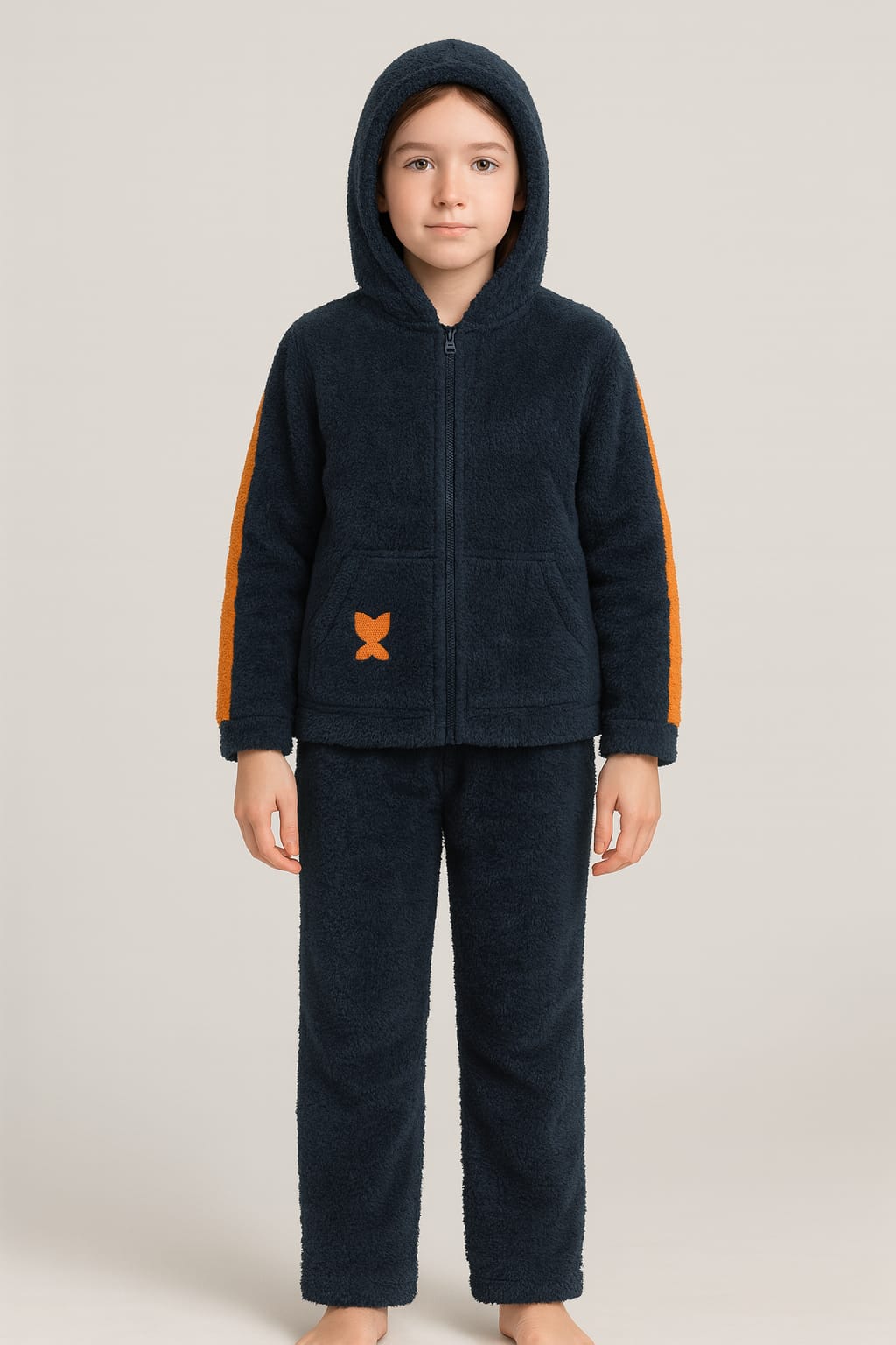 This two-piece winter set keeps her snug and stylish all season. Crafted from soft plush polyester fleece, the navy-blue jacket and matching pants provide lightweight insulation—fleece is known for preserving body heat while remaining remarkably soft and breathable. The hooded jacket features vibrant orange contrast stripes down each sleeve and a front zipper closure, while the pants have a full-length straight leg. Designed with a relaxed fit, this set offers plenty of room to layer and play comfortably. Ideal for indoor lounging or mild outdoor winter days, the playful orange accents and bow-logo detail add a fun pop of color to her cozy look.
